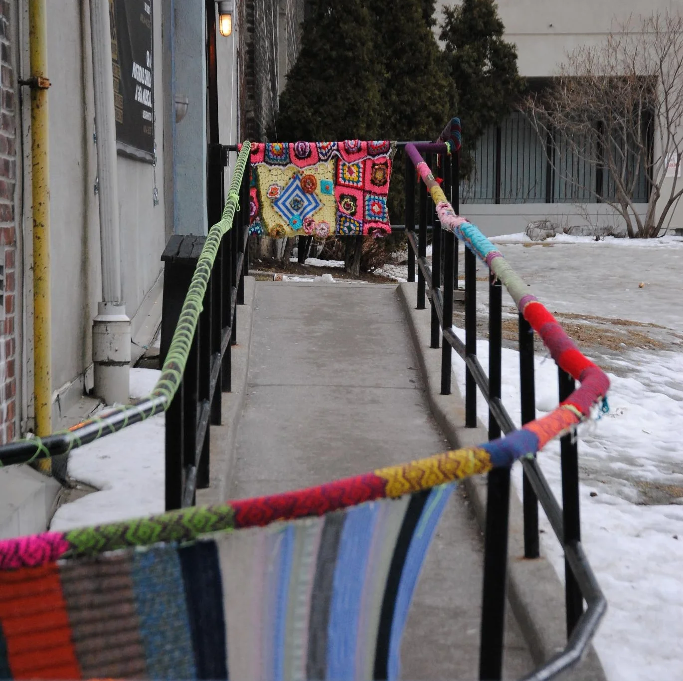 Leading up to the festival a group of artists and community members met regularly as a knitting circle to create large-scale pieces that knit bombed the outdoor and common spaces of Buddies in Bad Times Theatre with bright bursts of colour on the coldest of winter nights.